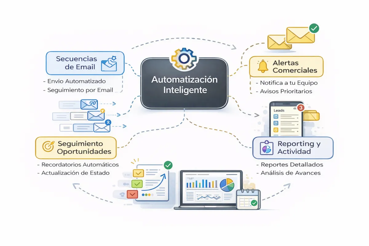 Secuencias de email, seguimiento automático de oportunidades, alertas para tu equipo comercial y reporting de actividad. El sistema trabaja aunque tu equipo esté ocupado con el día a día.